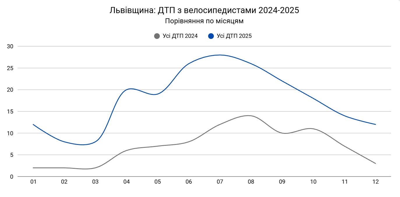 Статистика надана Департаментом Патрульної поліції України у Львівській області на запит Львівської асоціації велосипедистів. Дані охоплюють 2022–2025 роки з розбивкою по місяцях, окремо для Львова та Львівської області. Усі цифри доступні в Excel-таблиці.